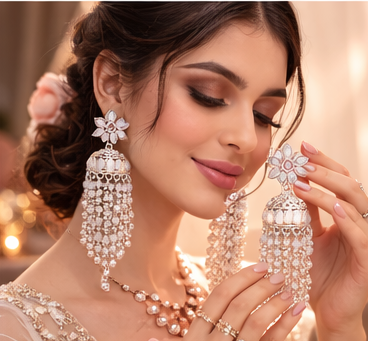 Make a bold and elegant statement with our Luxury Silver Pearl Tassel Jhumka Earrings. Designed with intricate floral studs featuring opalescent stones and a soft pink center accent, these earrings flow into a beautifully crafted dome adorned with delicate pearl and silver bead tassels.