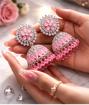 Add a touch of royal charm to your jewellery collection with these beautifully crafted Pink Crystal Floral Jhumka Earrings. Designed with intricate silver detailing and shimmering crystal embellishments, these earrings are perfect for weddings, festive occasions, parties, and traditional events.